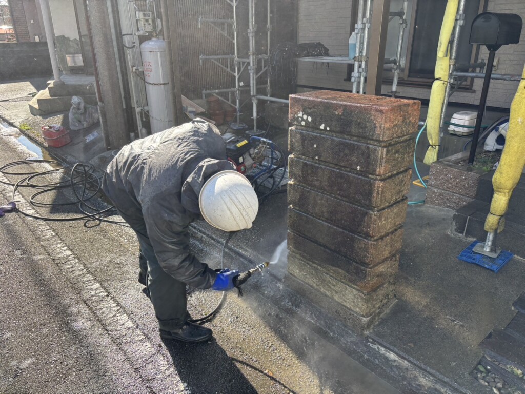 屋根・外壁だけではなく、塀や玄関ポーチなどもきれいに洗い流していきます。