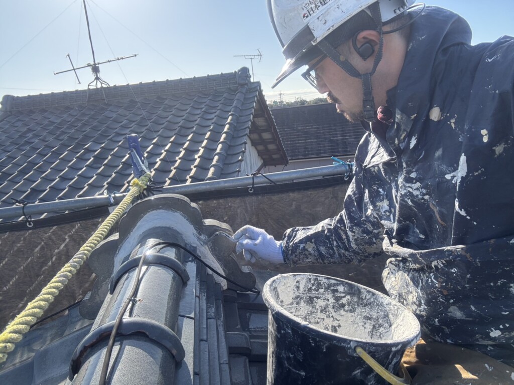 漆喰で補修することで、屋根材の隙間を埋め、屋根内部への水の侵入を防いでいきます。