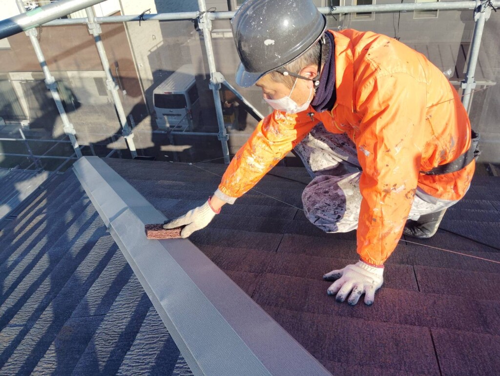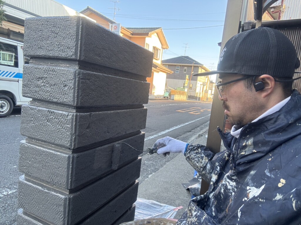こちらの現場では、門柱の塗装作業を行なっています。