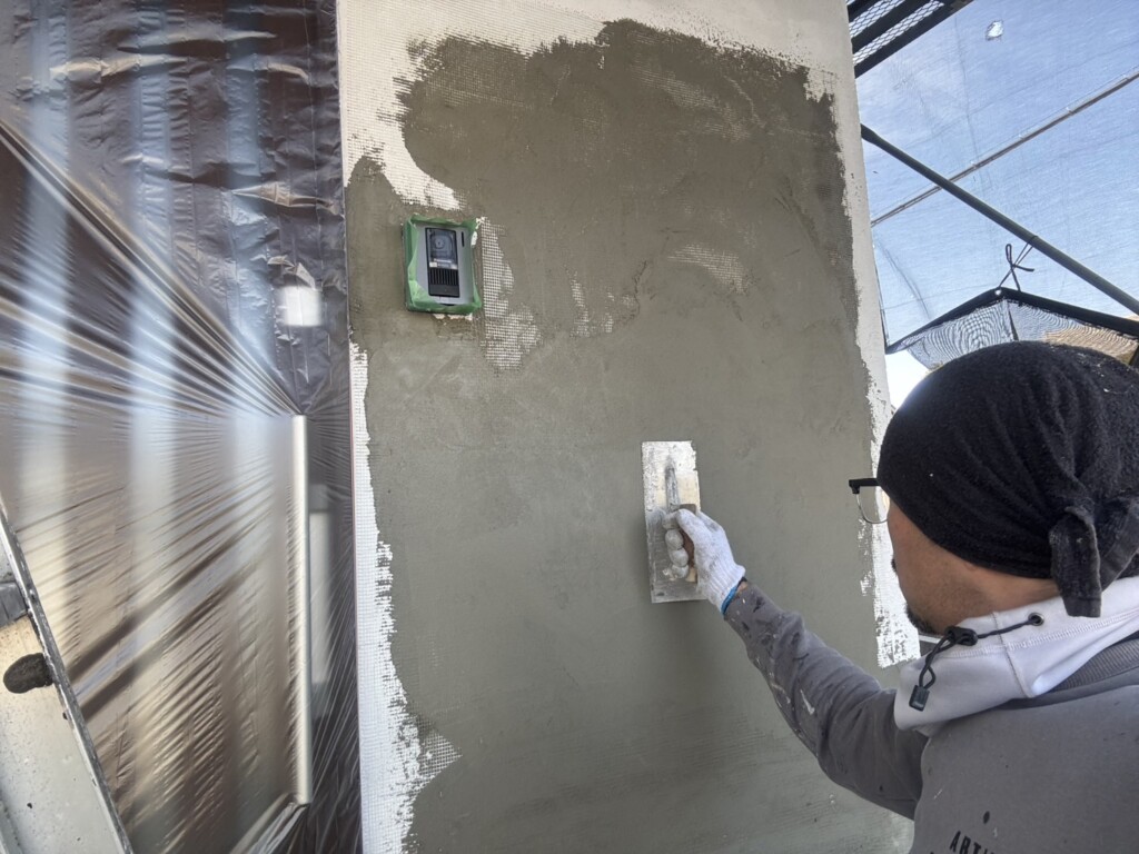 こちらの現場では、外壁のモルタル作業を行なっています。