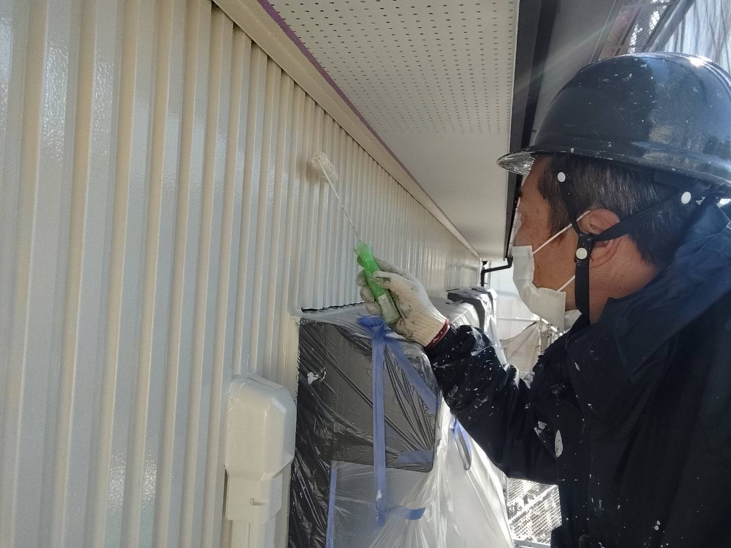 こちらの現場では、トタンの上塗り作業を行なっています。