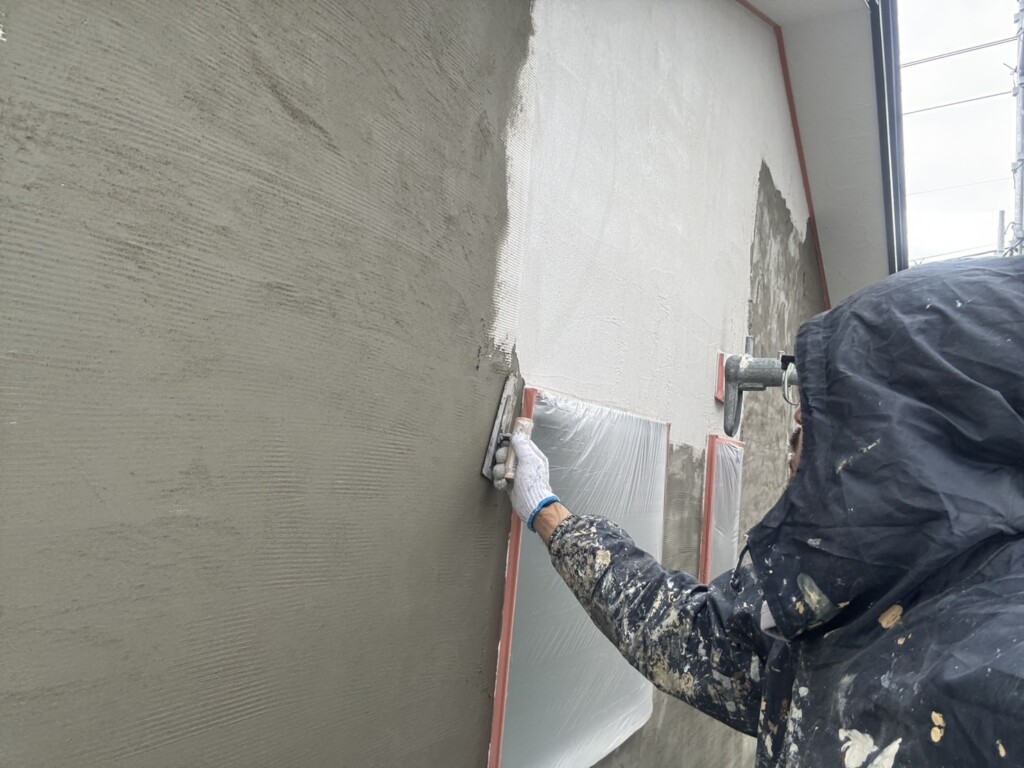 こちらの現場では、外壁のモルタル作業を行なっています。