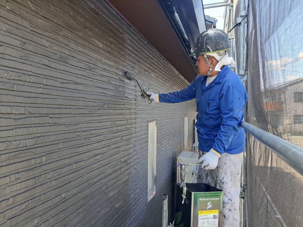 こちらの現場では、外壁の上塗り作業を行なっています。