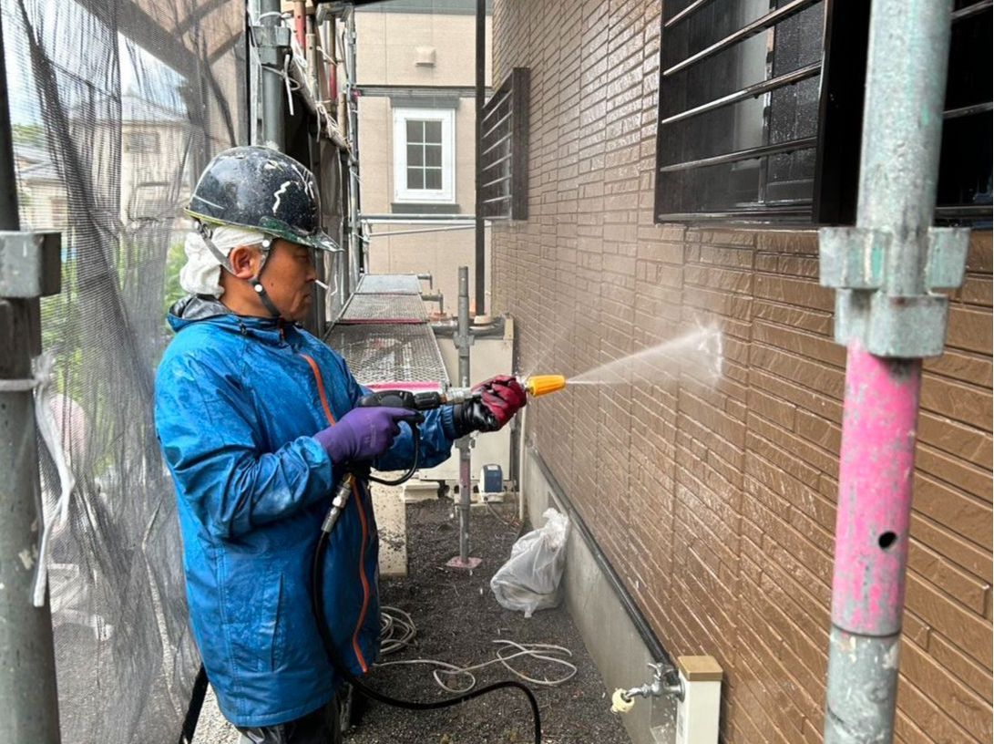 足場が立ったら、次は高圧洗浄です。隅々まで汚れを落としていきます。