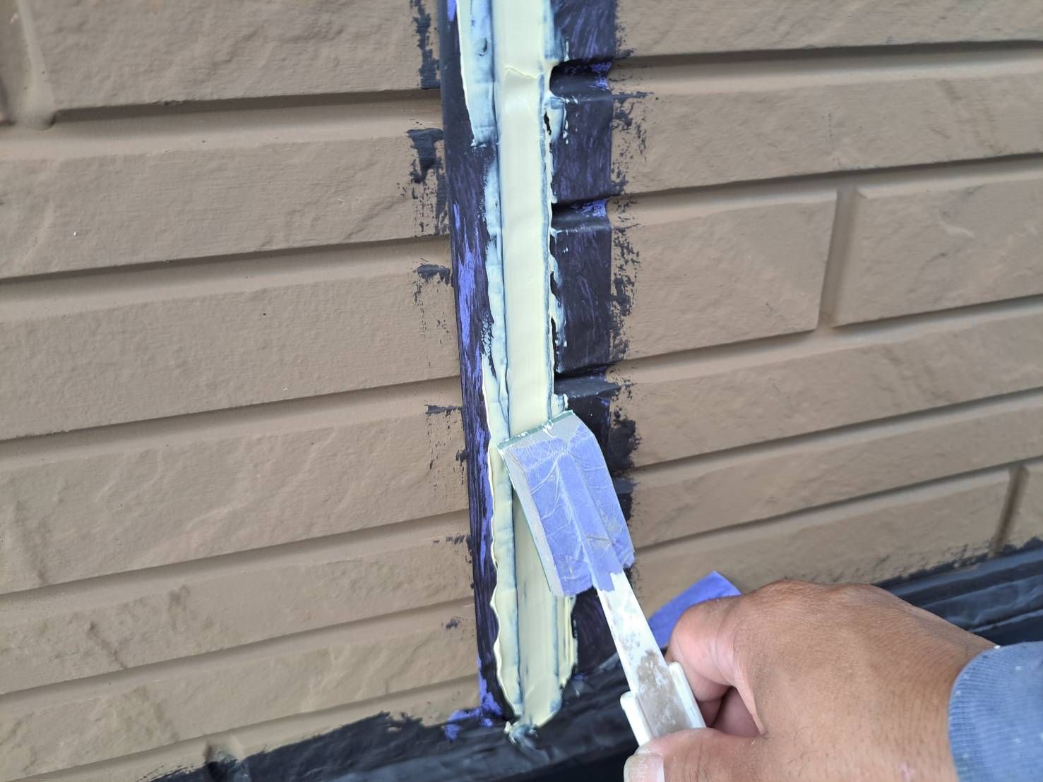 コーキングを充填し、その後ヘラを使って平らになるように均していきます。