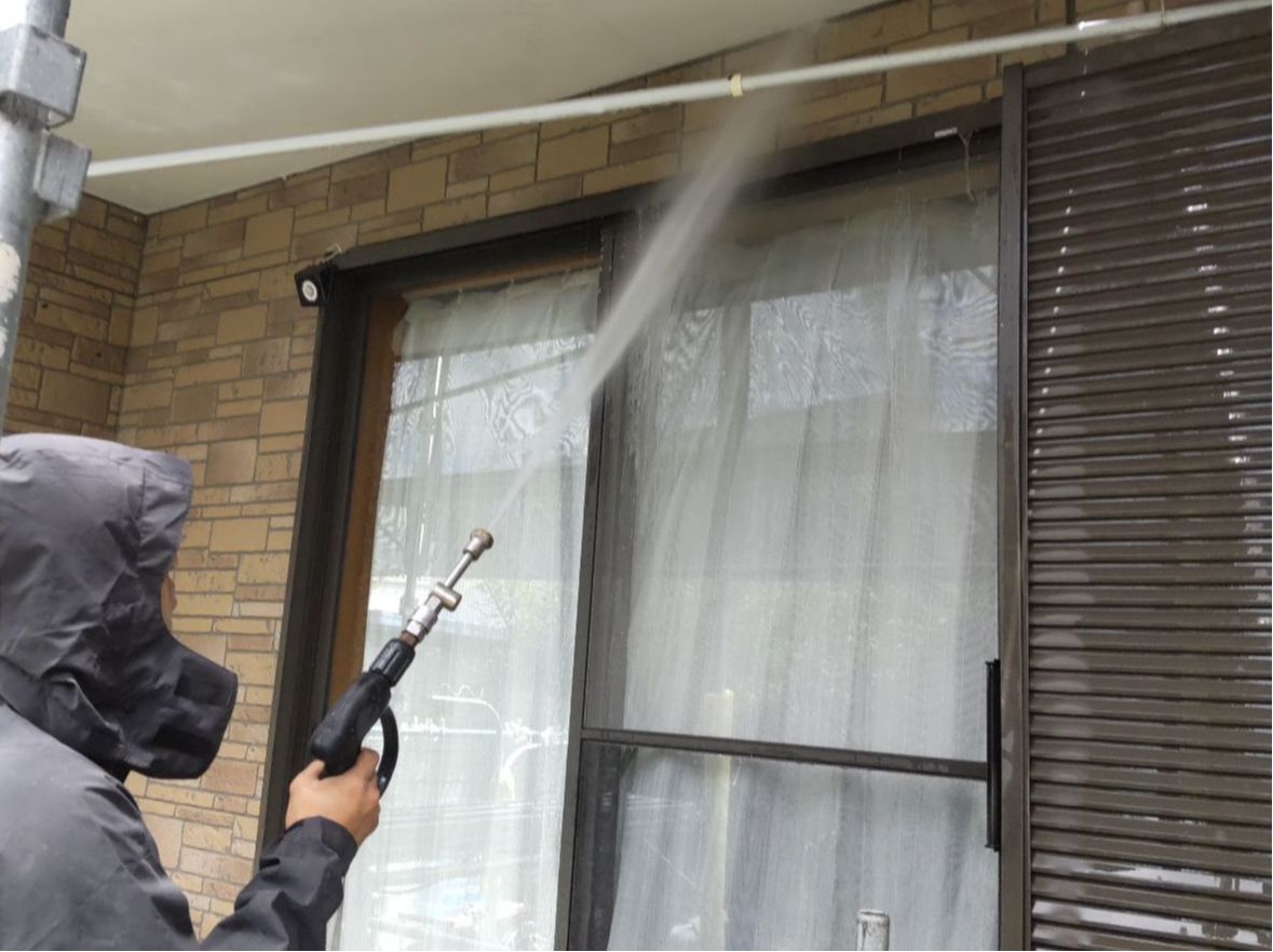 足場が立ったら、次は高圧洗浄です。隅々まで汚れを落としていきます。