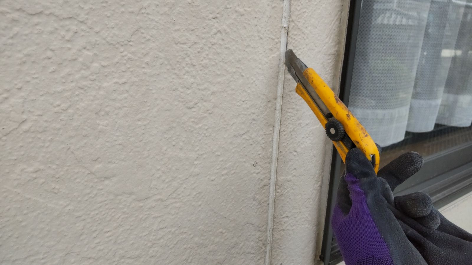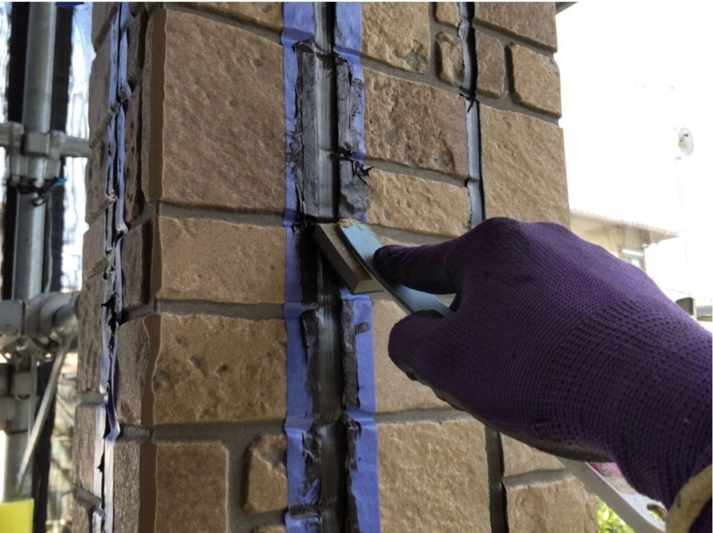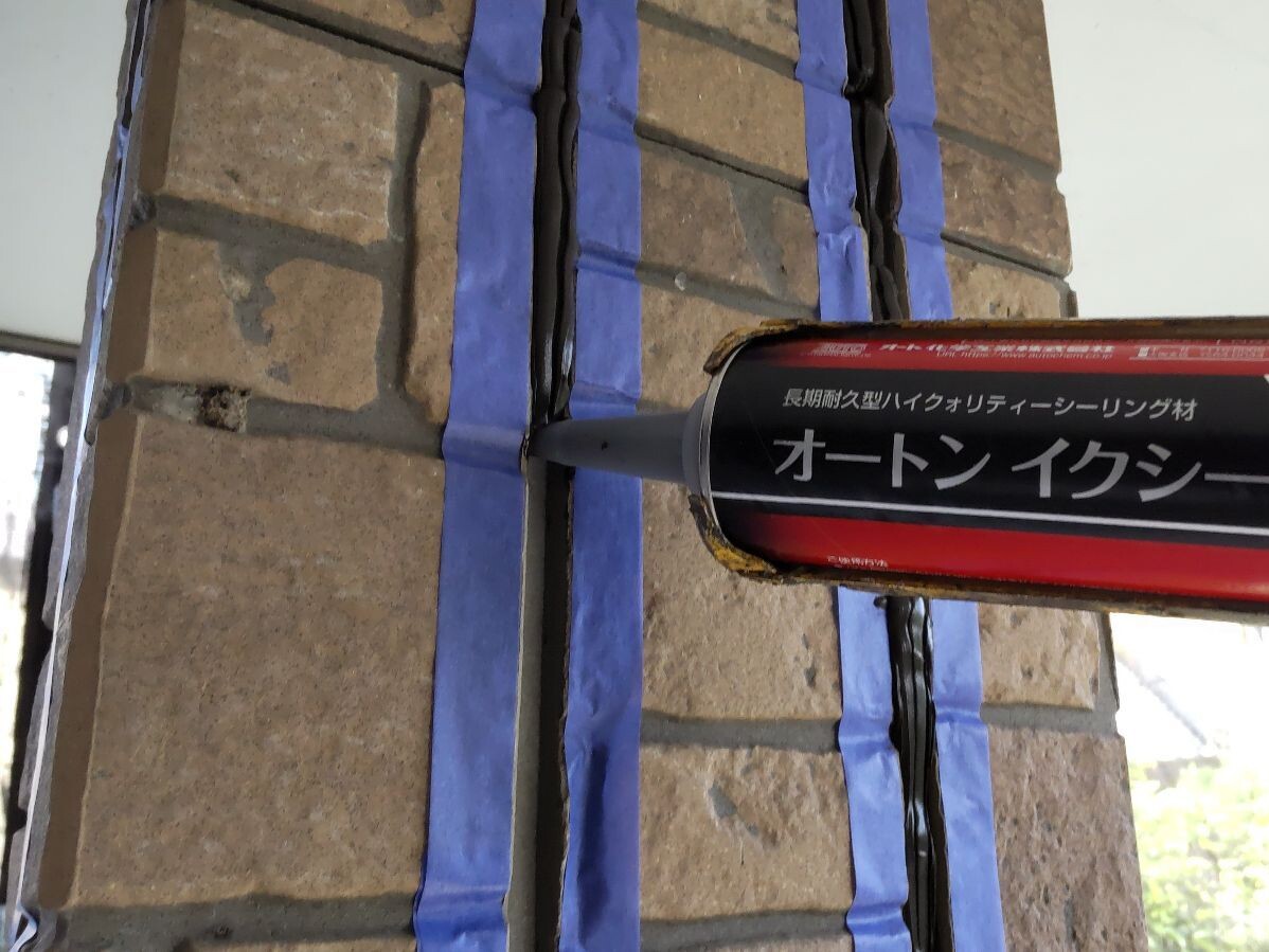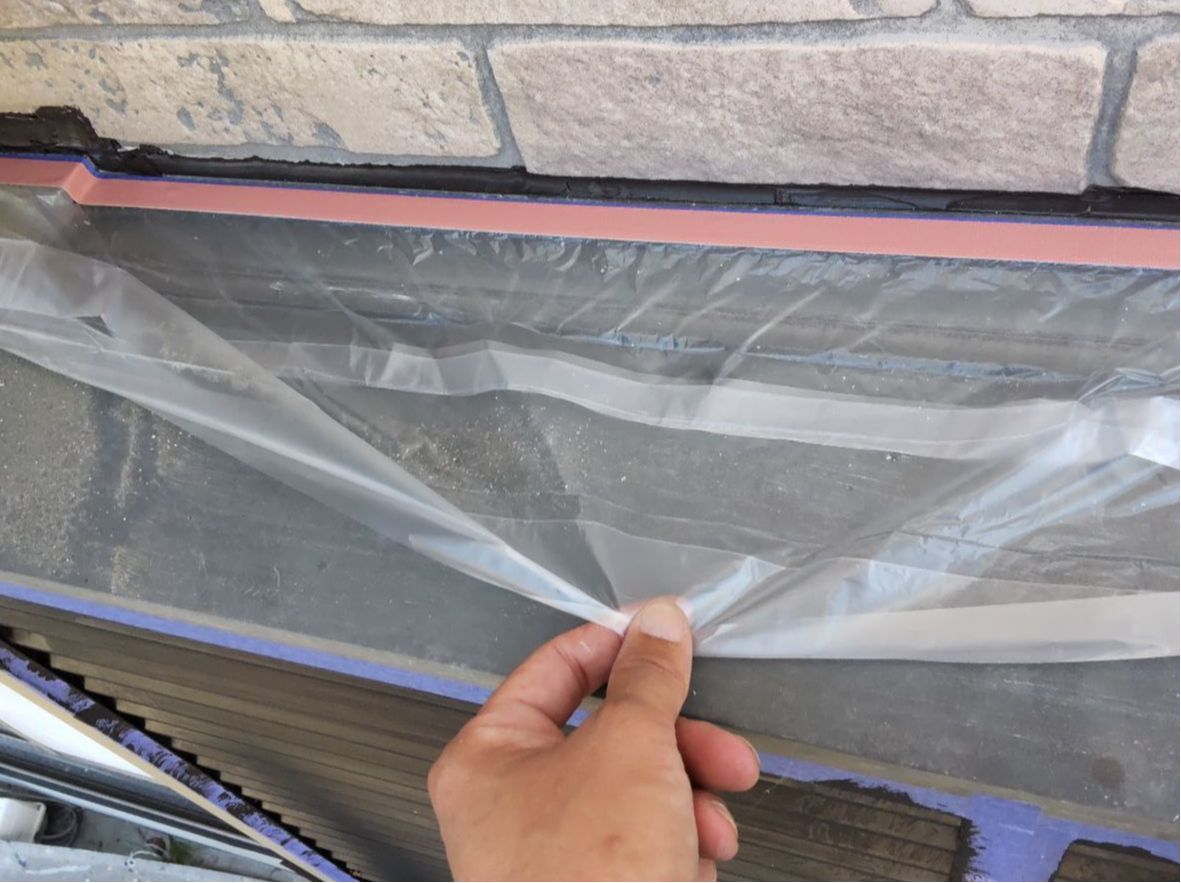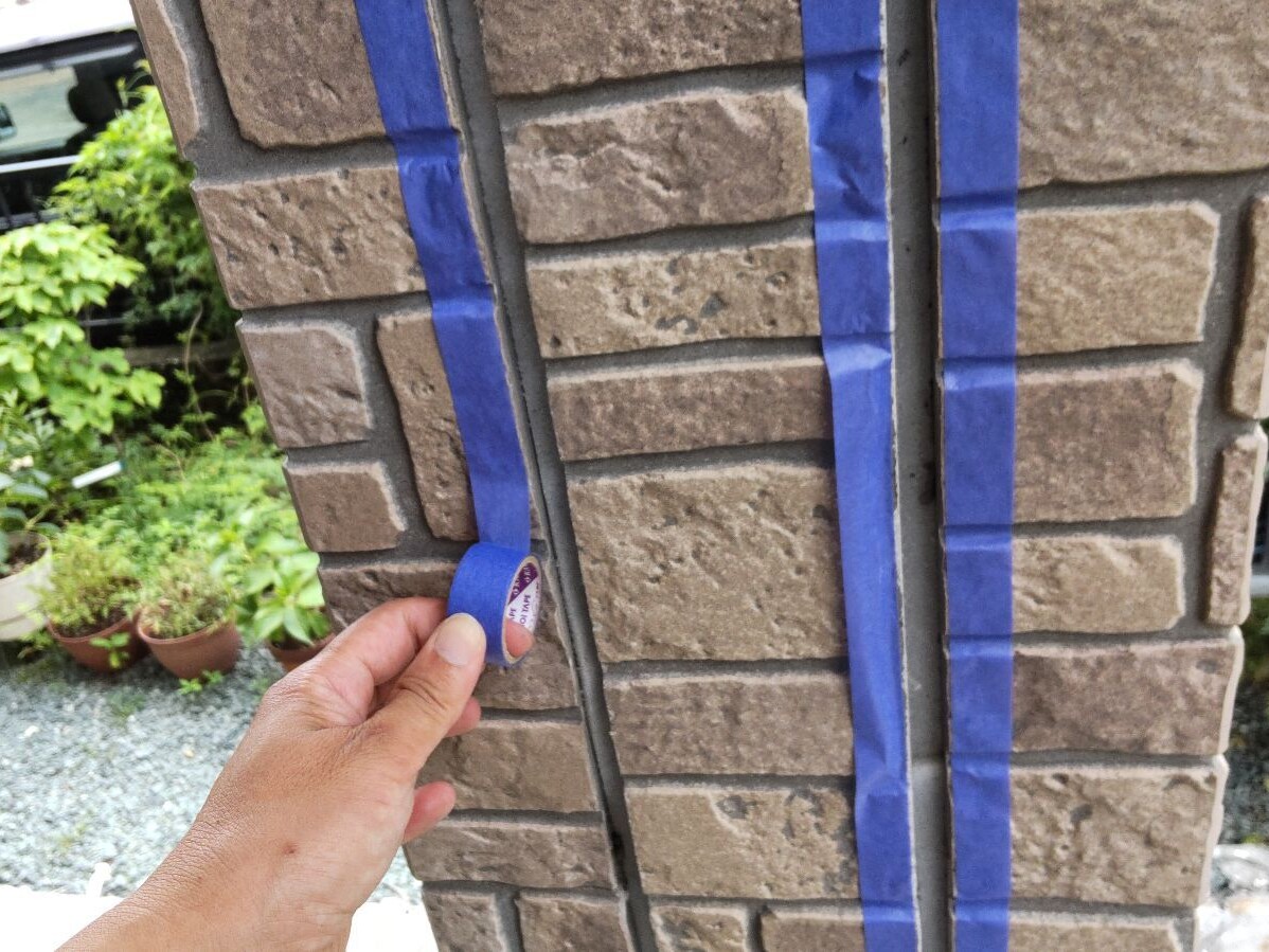 充填したコーキング材で外壁を汚さないように、マスキングテープで養生していきます。