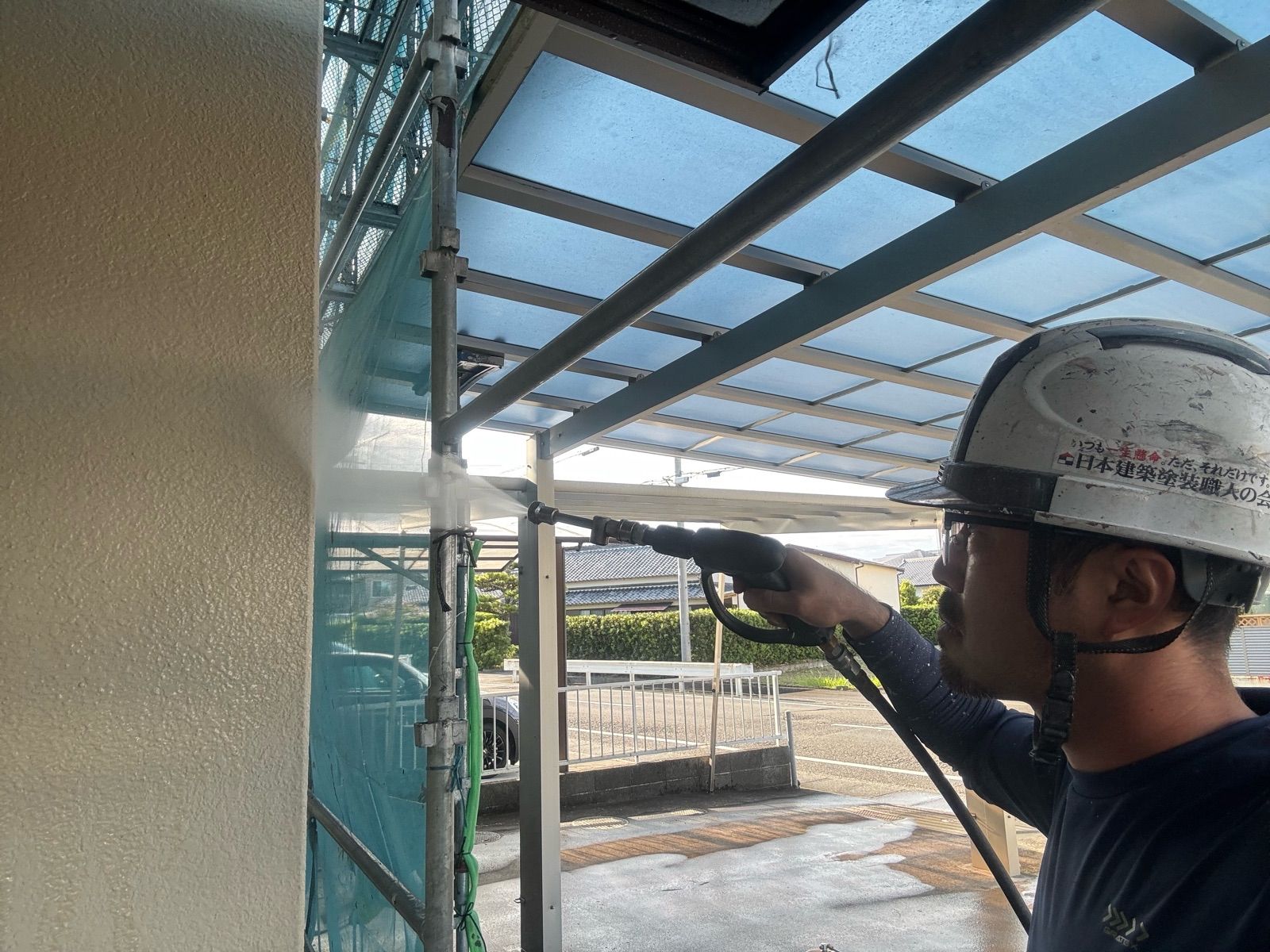 足場が立ったら、次は高圧洗浄です。隅々まで汚れを落としていきます。